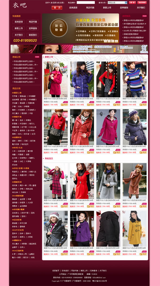 項目名稱:衣吧網網站制作簽定日期:2010年1月18日制作要求:網站采用PHP語言,mysql數據庫,網站主要欄目包括:首頁、實體進貨、網店代銷、新款上市、定單查詢、關于我們等等,網站帶有會員注冊及購物系統。網站首頁效果: