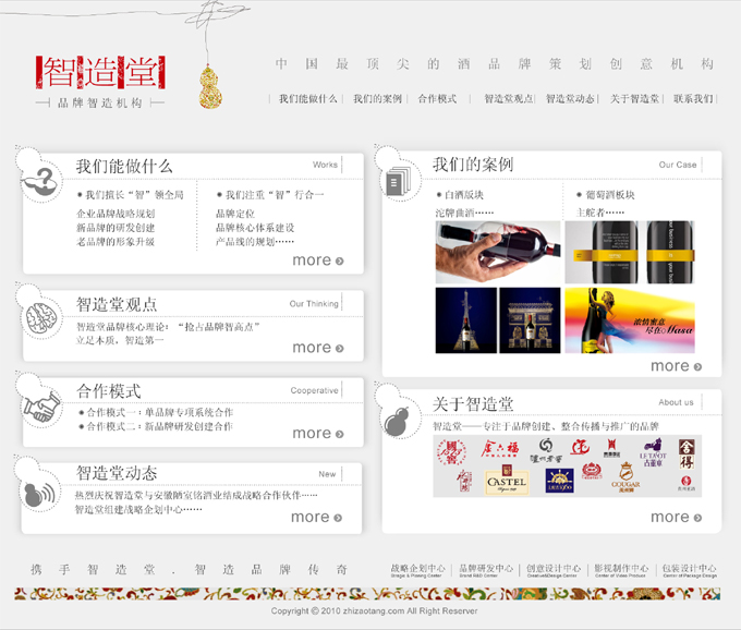 項(xiàng)目名稱:智造堂品牌智造機(jī)構(gòu)網(wǎng)站改版簽定日期:2010年8月9日網(wǎng)站網(wǎng)址:www.zhizaotang.com智造堂品牌智造機(jī)構(gòu)是一家專注于品牌創(chuàng)建、整合傳播與推廣的系統(tǒng)性品牌服務(wù)公司。智造堂為客戶提供企業(yè)戰(zhàn)略規(guī)劃、品牌策略制定、廣告創(chuàng)意表