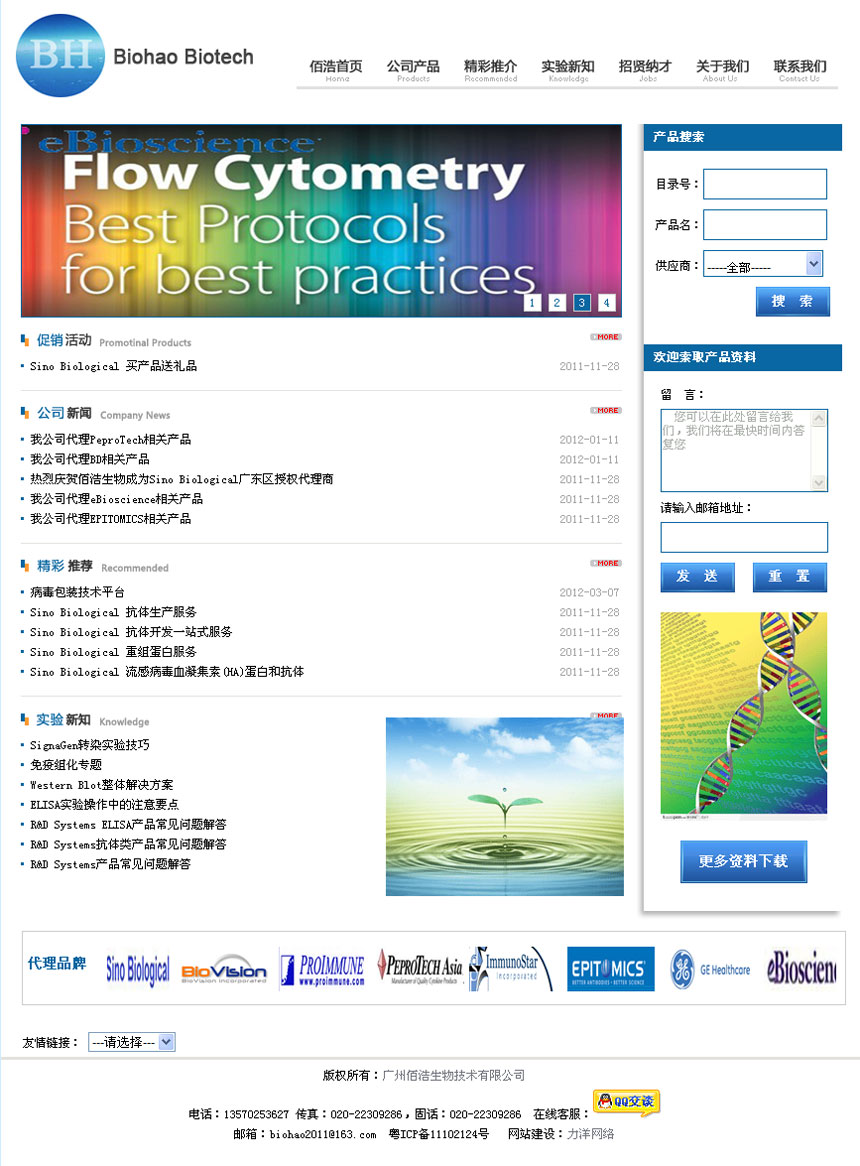 項目名稱:廣州佰浩生物技術有限公司網站建設簽定日期:2011年11月24日網址:http://www.gzbiohao.com/廣州佰浩生物技術有限公司是一家專業從事生物試劑研發、生產和銷售的高新技術企業。其產品和服務涵蓋了分子生物學、蛋白