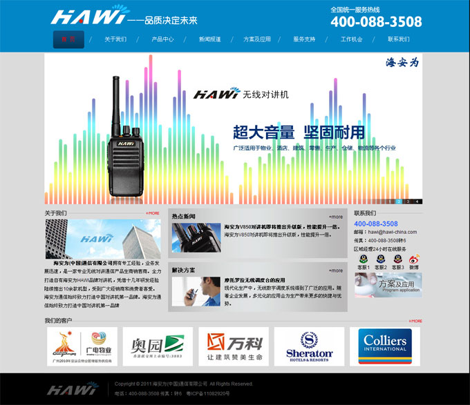 項目名稱:廣州海安為通信技術有限公司網站建設簽定日期:2011年12月3日網址:http://www.hawi-china.com/海安為(中國)通信有限公司擁有專工經驗,業務發展迅速,是一家專業無線對講通信產品生商銷售商。全力打造自有海安