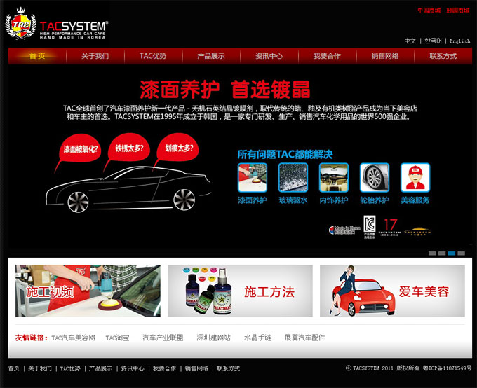 項目名稱:賽伯汽車用品網站建設簽定日期:2012年2月3日網址:http://www.tacsystemcar.comTACSYSTEM1995年成立于韓國SOONCHUN,是一家專門研發、生產、銷售汽車美容用品的綜合性企業。主要生產和經營