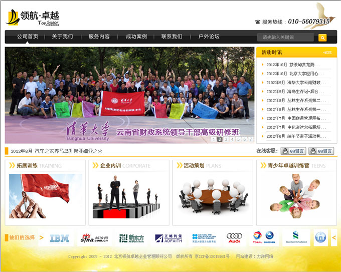 項目名稱:北京領航卓越企業管理顧問有限公司網站建設簽定日期:2012年2月29日網址:http://www.topsailor.com.cn北京領航卓越企業管理顧問有限公司成立于2006年,位于北京。在中國體驗式培訓快速發展的市場機遇下,領