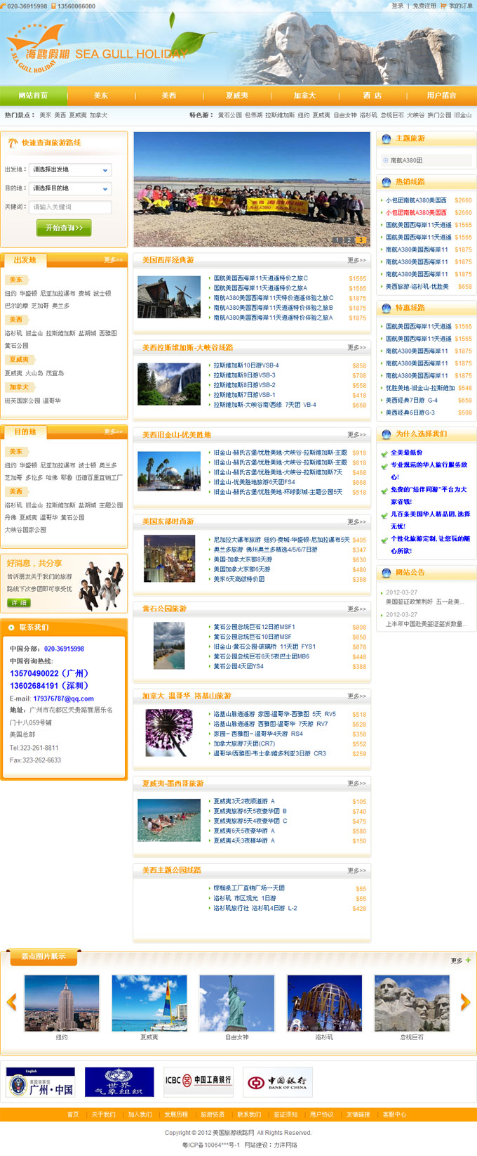 項(xiàng)目名稱:美國海鷗旅游集團(tuán)公司網(wǎng)站建設(shè)簽定日期:2012年3月2日網(wǎng)址:http://www.haiouholiday.com 美國海鷗旅游集團(tuán)公司是一家集旅游產(chǎn)品批發(fā)、散客/團(tuán)體接待和巴士租賃業(yè)務(wù)于一身的大規(guī)模集團(tuán)公司,總部設(shè)在美國洛杉