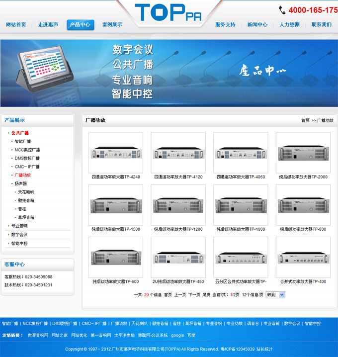 廣州市惠聲電子科技有限公司(TOPPA是廣州市惠聲電子科技有限公司在中國大陸地區合法注冊的品牌商標)成立于1997年占地面積18000平方米是一家致力于公共廣播、數字會議系統、專業音響、智能中控等設備的設計、生產、銷售、專業咨詢服務為一體的綜合性高科技企業,總部座落在素有中國音響產業基地之稱的廣州番禺。產品廣泛應用于:政府機關、學校、酒店、醫院、監獄、辦公大樓、體育場館、超市、公園、旅游景點、步行街、廣場、車站、碼頭、工廠企業、超市、機場等各種場所。