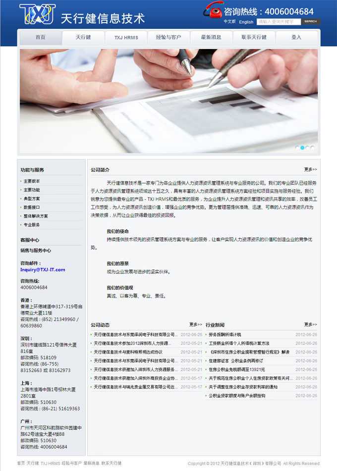 項目名稱:天行健信息技術網站建設簽定日期:2012年5月10日網址:http://www.txj-it.com天行健信息技術是一家專門為各企業提供人力資源資訊管理系統與專業服務的公司。我們的專業團隊已經服務于人力資源資訊管理系統領域達十五之