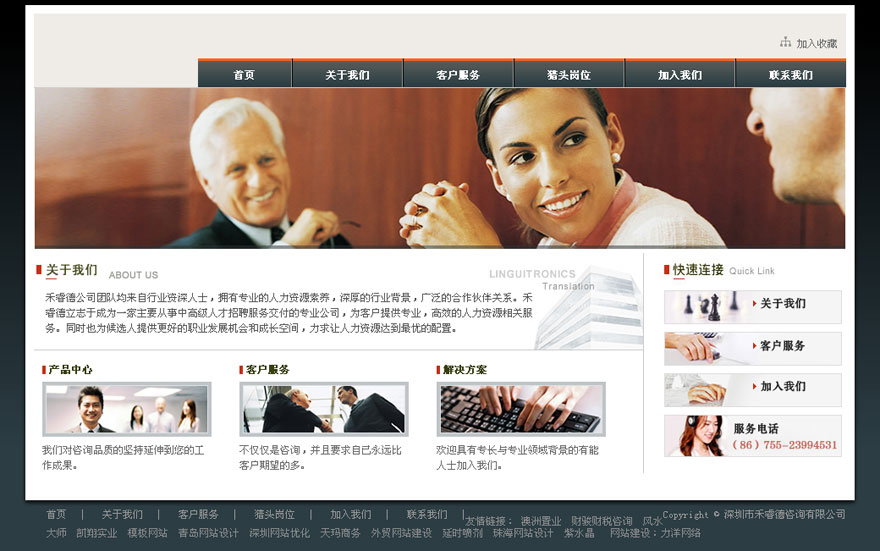 項目名稱:禾睿德網站建設簽定日期:2012年12月18日網址:http://www.hredy.com/禾睿德公司團隊均來自行業資深人士,擁有專業的人力資源素養,深厚的行業背景,廣泛的合作伙伴關系。禾睿德立志于成為一家主要從事中高級人才招聘