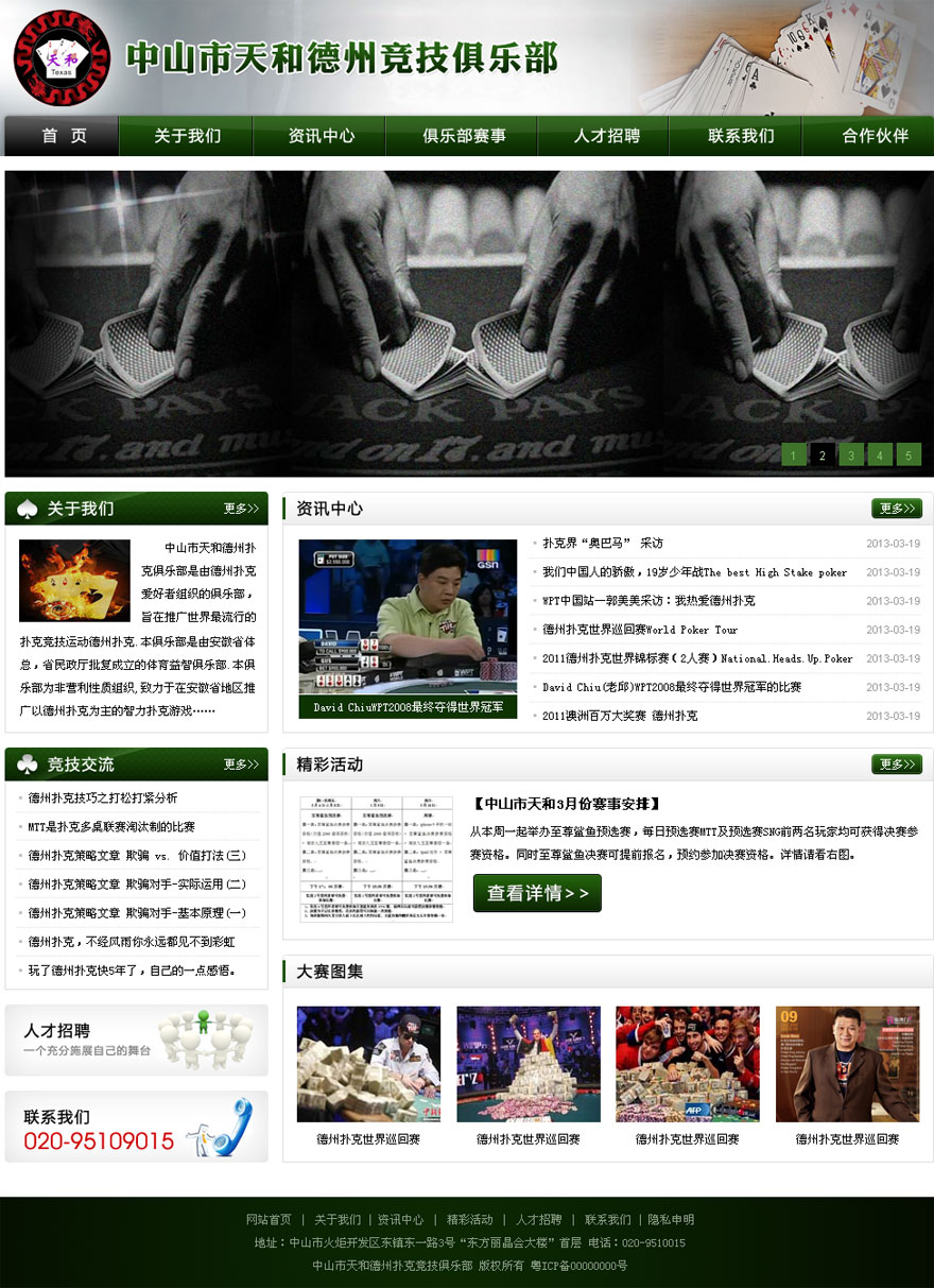項目名稱:中山市天和德洲競技俱樂部網站建設簽定日期:2013年3月13日網址:http://www.thpokerclub.com中山市天和德州撲克俱樂部成立于2013年2月,作為中山市首家具備規模的德州撲克智力競技運動機構,本俱樂部致力于