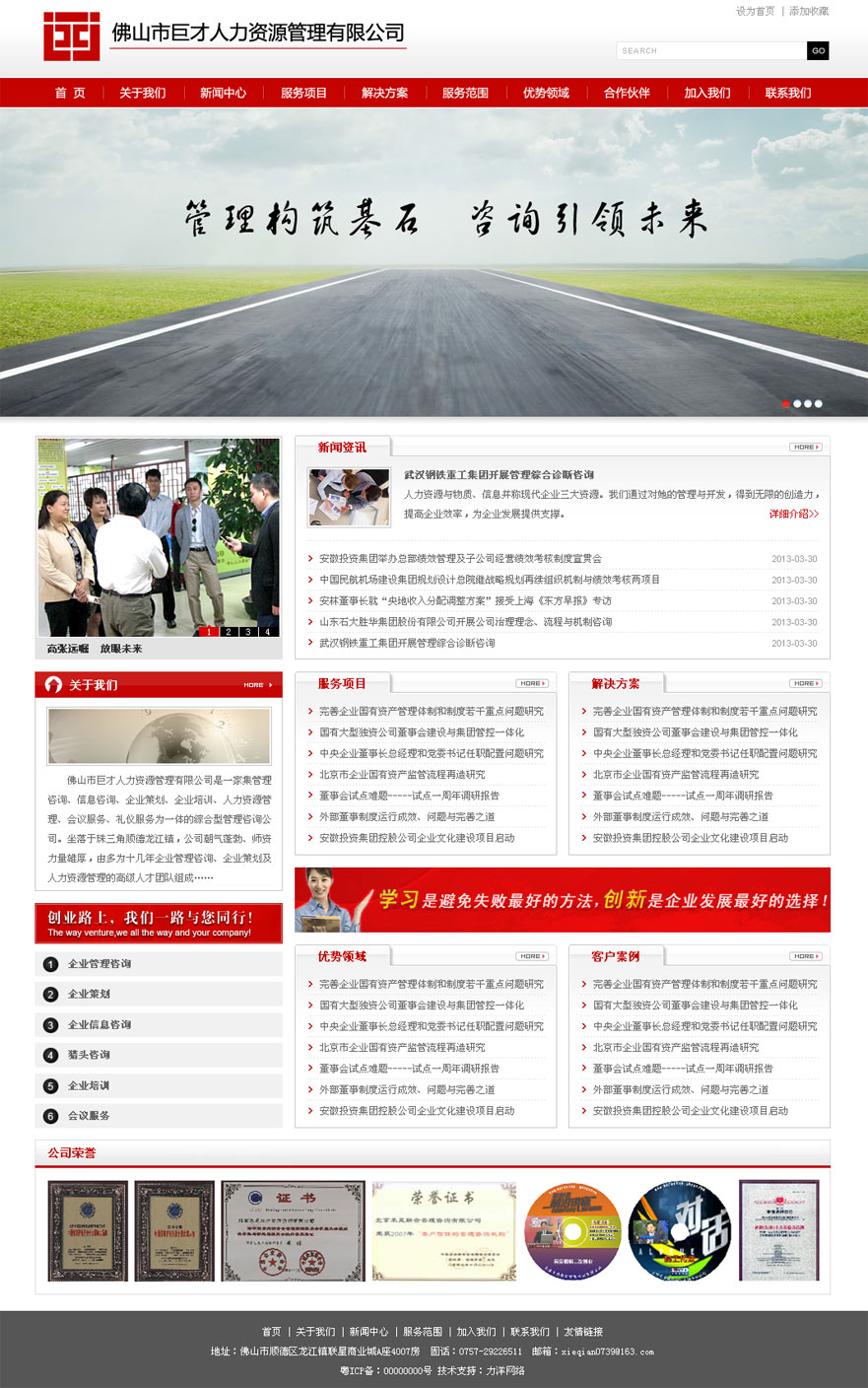 項目名稱:佛山市巨才人力資源網站建設簽定日期:2013年3月21日網址:http://www.jchrgl.com佛山市巨才人力資源管理有限公司是一家集管理咨詢、信息咨詢、企業策劃、企業培訓、人力資源管理、會議服務、禮儀服務為一體的綜合型管