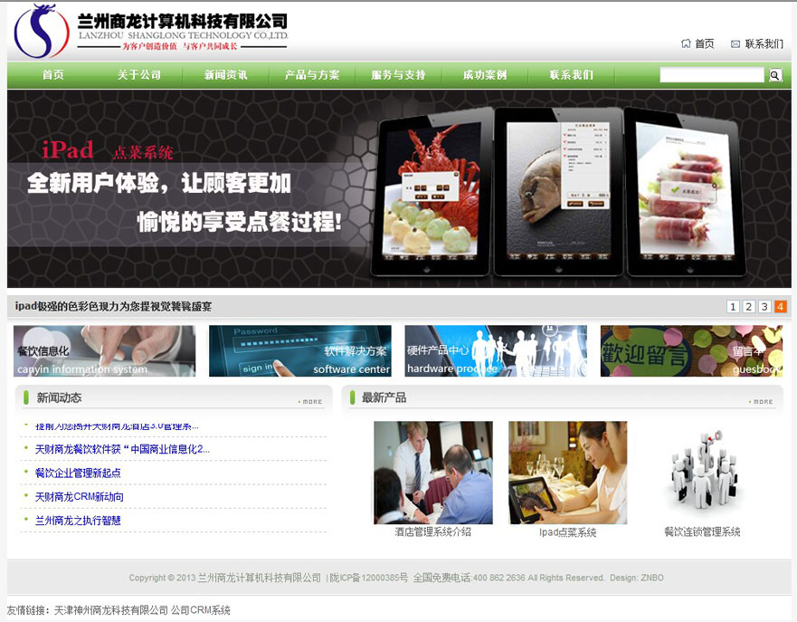 項目名稱:蘭州商龍計算機科技有限公司網站建設簽定日期:2013年4月8日網址:http://www.lzslsoft.com蘭州商龍計算機科技有限那公司成立于2006年5月,公司主要涉及酒店餐飲娛樂及醫藥行業的管理軟件、監控系統及弱電綜合布