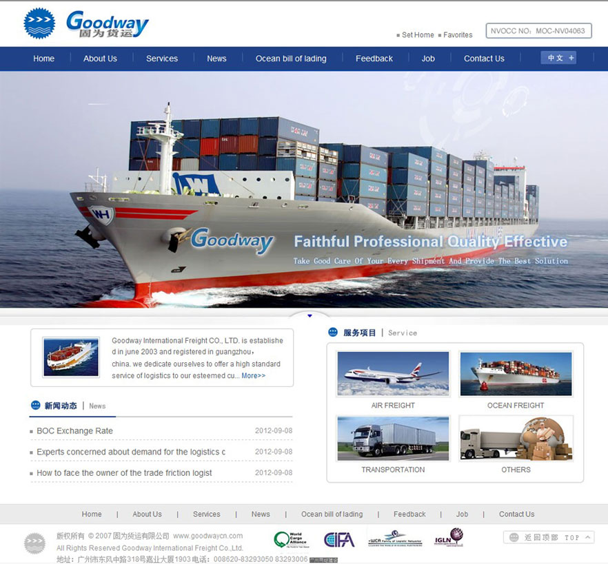 項目名稱:固為貨運網站建設簽定日期:2013年4月11日網址:http://www.goodwaycn.comGOODWAYINTERNATIONALFREIGHTCO.,LTD.isestablishedinJune2003andregi