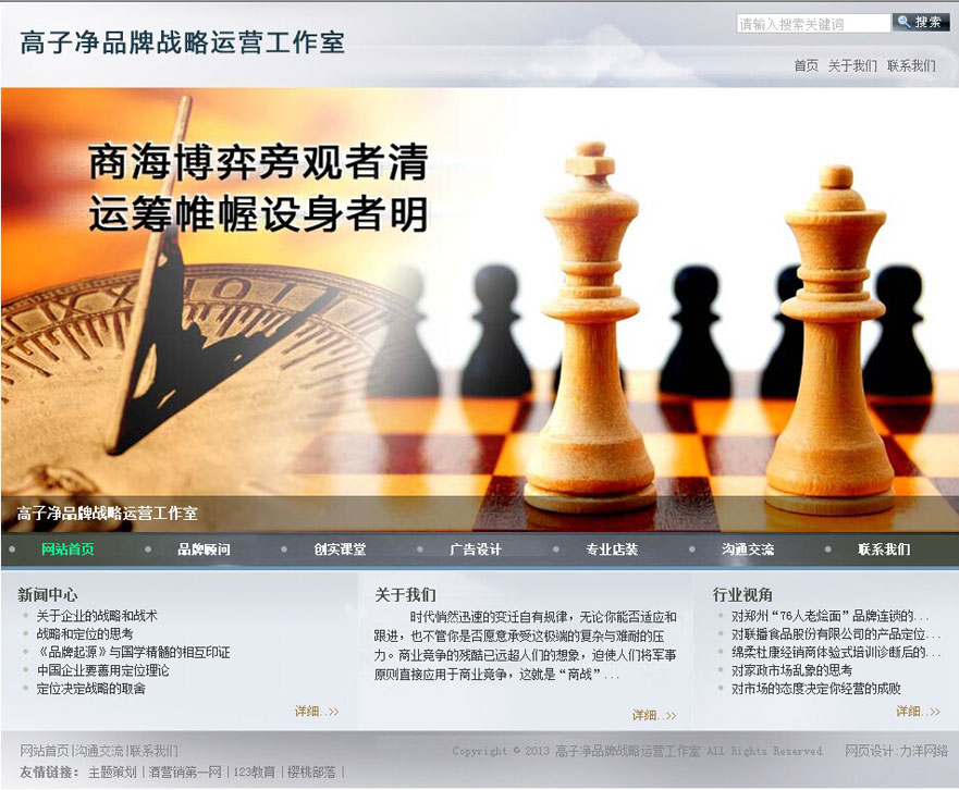 項目名稱:高子凈品牌戰略運營工作室網站建設簽定日期:2013年4月23日網址:http://www.gaozijing.com品牌是當今時代背景下,企業發展戰略的指南針,而不是戰略棋子;品牌是聚焦的奇點;品牌的定位關系到全方位的管理布局和資
