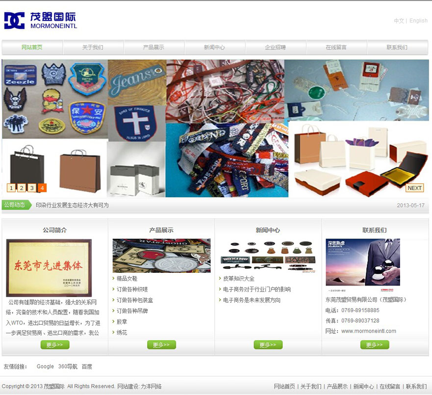 項(xiàng)目名稱:茂盟國際網(wǎng)站建設(shè)簽定日期:2013年5月8日網(wǎng)址:http://www.mormoneintl.com茂盟國際貿(mào)易有限公司成立于2009年,是經(jīng)營進(jìn)出口貿(mào)易的專業(yè)外貿(mào)公司,開展國內(nèi)外貿(mào)易,中外合資、合作生產(chǎn),轉(zhuǎn)口貿(mào)易等方式的經(jīng)營業(yè)