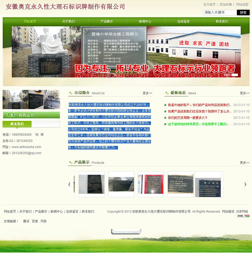 項目名稱:安徽奧克永久性大理石標識牌制作有限公司網站建設簽定日期:2013年5月20日網址:http://www.anhuiaoke.com安徽奧克永久性大理石標識牌制作有限公司成立于2007年,是一家專業設計研發制作大理石標識類的綜合性企