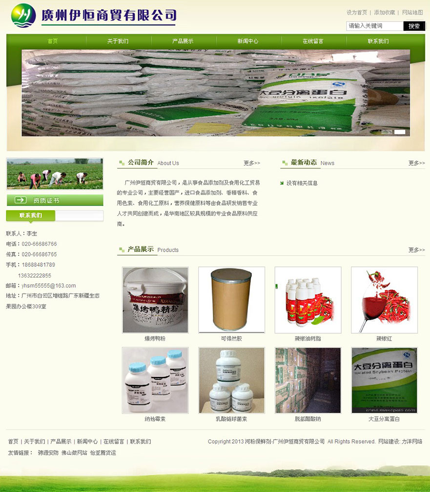 項目名稱:廣州伊恒商貿有限公司網站建設簽定日期:2013年6月3日網址:http://www.yhsm555.com廣州伊恒商貿有限公司,是從事食品添加劑及食用化工貿易的專業公司,主要經營國產,進口食品添加劑、香精香料、食用色素、食用化工原