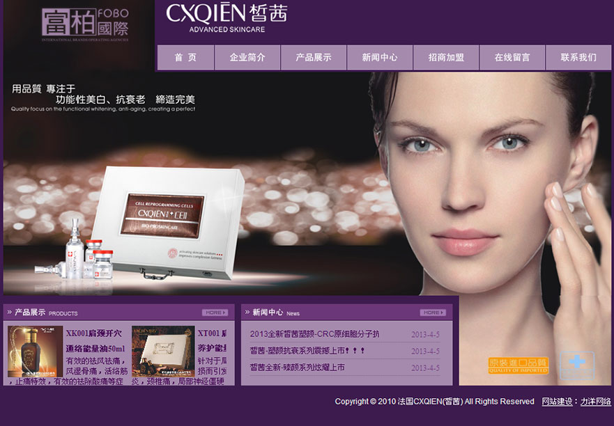 廣州富柏化妝品有限公司(富柏國際)是法國富柏國際集團的子公司,創業2005年。以美容化妝品及美容儀器為主,負責中港澳市場的品牌推廣、教育服務。憑借前瞻決策,根據中國特色及準確定位,三個美容品牌陸續占領市場。2005年初,引進歐利萊,走代理制,截止目前已簽訂二十個省級代理,年回款額八百萬多萬。2008年,皙茜臻顏系列進入中國。2011年,皙茜塑顏順應市場開始推廣。2013年初,塑顏CRC系列重磅推出,直擊高端美容店。