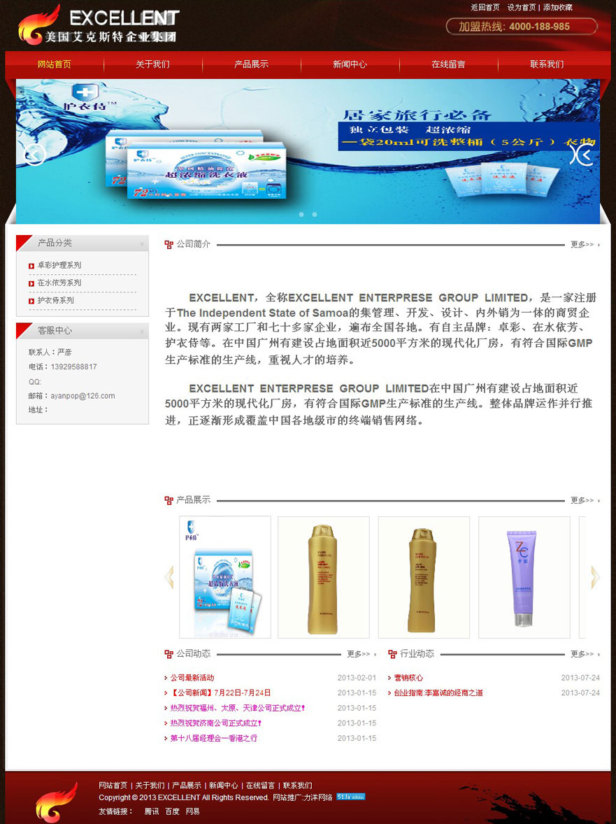 EXCELLENT,全稱EXCELLENT ENTERPRESE GROUP LIMITED,是一家注冊于The Independent State of Samoa的集管理、開發、設計、內外銷為一體的商貿企業。現有兩家工廠和七十多家企業,遍布全國各地。有自主品牌:卓彩、在水依芳、護衣侍等。在中國廣州有建設占地面積近5000平方米的現代化廠房,有符合國際GMP生產標準的生產線,重視人才的培養。