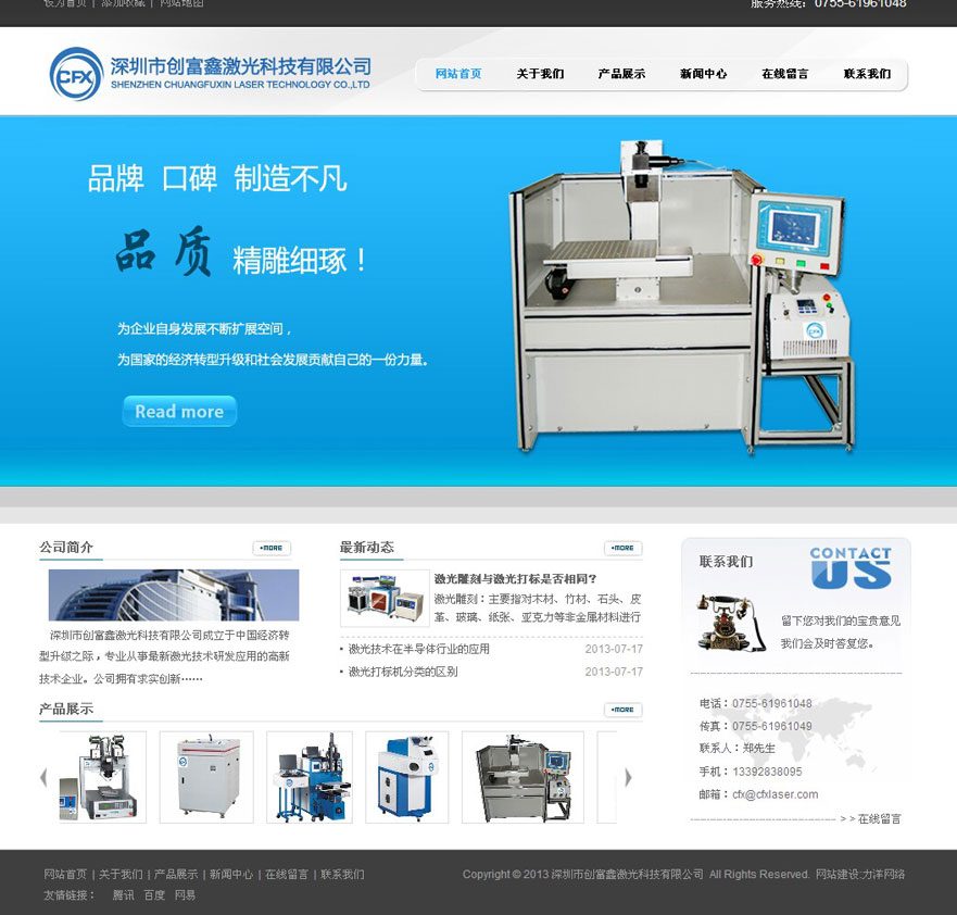 項目名稱:深圳市創富鑫激光科技網站建設簽定日期:2013年7月11日網址:http://www.cfxlaser.com深圳市創富鑫激光科技有限公司成立于中國經濟轉型升級之際,專業從事最新激光技術研發應用的高新技術企業。公司擁有求實創新的高